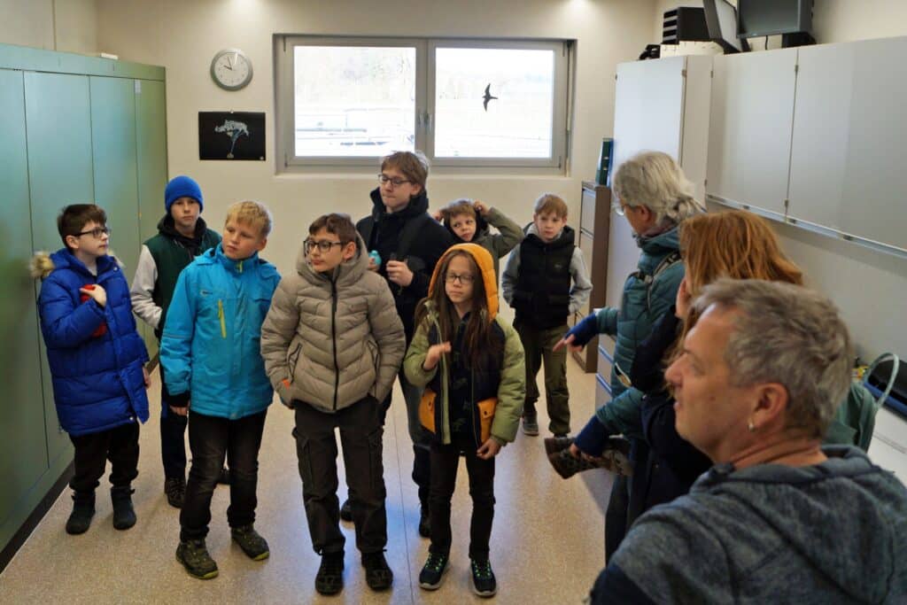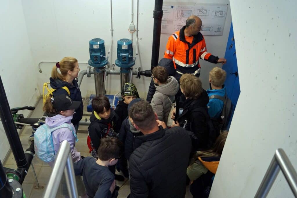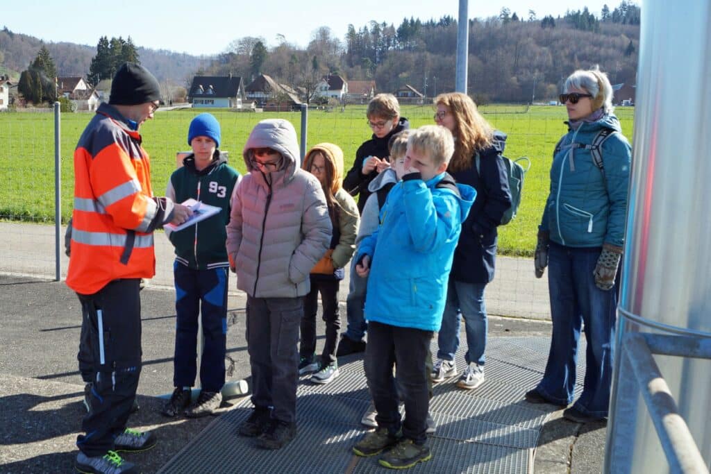 Am Mittwoch machten wir ein kleines «Reisli» mit dem Postauto zur Kläranlage ARA Schöftland. Dort erfuhren die Kinder, wie unser Abwasser wieder sauber wird. Zuvor gab es feine Weggli, denn später bei den besonderen Düften hätten vermutlich manche keinen Appetit mehr gehabt. Die Kinder staunten, als sie hörten, dass das «Geschäft» vom WC der SSW bis zur Kläranlage etwa 1,5 Stunden unterwegs ist.