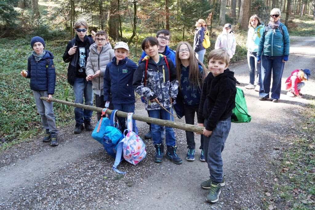 Nach einer kleinen Stärkung mit Sandwiches und Spielen im Wald folgten die Kinder in kleinen Gruppen den kleinen Quellen und Bächlein, die wenige hundert Meter später in unser Ruederchen münden und auf eine lange Reise ins Meer gehen. Dabei entdeckten sie sogar einen alten Autoreifen! Gemeinsam gruben sie ihn aus und schleppten ihn zurück zur Schule. Ein tolles Beispiel dafür, wie sie fürs Klima aktiv waren und gleichzeitig wunderbar zusammenarbeiteten.